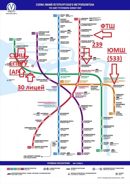 Официальная схема 2019 года Современная схема, появившаяся после открытия трёх новых станций Пятой линии: «Проспект Славы», «Дунайская» и «Шушары». В отличии от предыдущих схем, с нынешней исчезли все строящиеся станции, что породило немало пессимистичных слухов среди петербуржцев. Тем не менее, несмотря на это, метрополитен в Санкт-Петербурге продолжает строиться. |