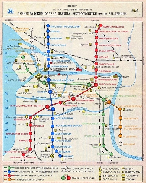 Схема 1988 года Схема нанесена на условную карту города, где отмечены Нева и ее рукава, а так же река Фонтанка, Охта и Канал Грибоедова. Помимо линий метро и железнодорожных линий на схему нанесены достопримечательности, музеи, универмаги, театры и т.п. | |