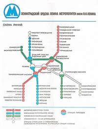 Электросветовая схема Ленинградского метрополитена в переходе станции «Технологический институт». Схема существовала довольно долгое время в торце перехода со станции «Технологический институт-1» на станцию «Технологический институт-2». По состоянию на 1963 год действуют первые два участка Кировско-Выборгской и Московско-Петроградской линии. Невско-Василеостровская линия изображена строящейся. До 1995 года схема регулярно обновлялась, незадолго до празднования 300-летия Санкт-Петербурга в 2003 году была демонтирована. | |
