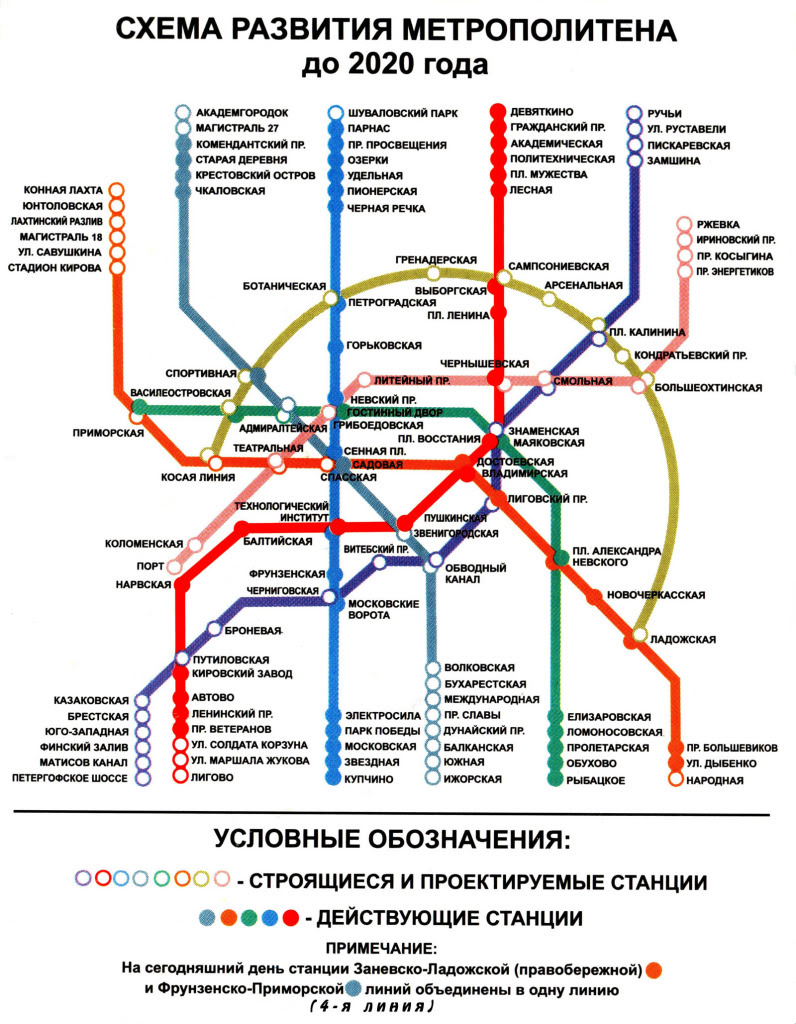 Пятая линия — Фрунзенско-Приморская появилась на схеме только в 2008 году после открытия станций «Волковская» и «Звенигородская».