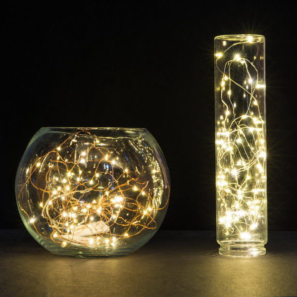 Стоит также помнить, что от выбора лампочек зависит то, каким получается тип освещения. Чтобы получить в комнате теплый свет, выбирайте желтые лампочки. А в темно-синей бутылке с белыми лампочками вы сможете создать источник холодного света.
