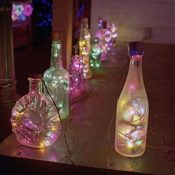 Гирлянды можно либо просто зафиксировать на поверхности бутылки, либо же поместить несколькими способами внутрь. Красивее всего получится, если просверлить дно и провести гирлянду внутрь бутылки, выводя края наружу. Так получится достаточно аккуратный и красивый светильник.