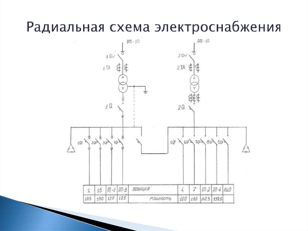 При радиальной схеме электроснабжения каждая линия является как бы лучом, соединяющим узел сети с единственным потребителем. Ну, а в общем комплексе сети эти схемы могут сочетаться.