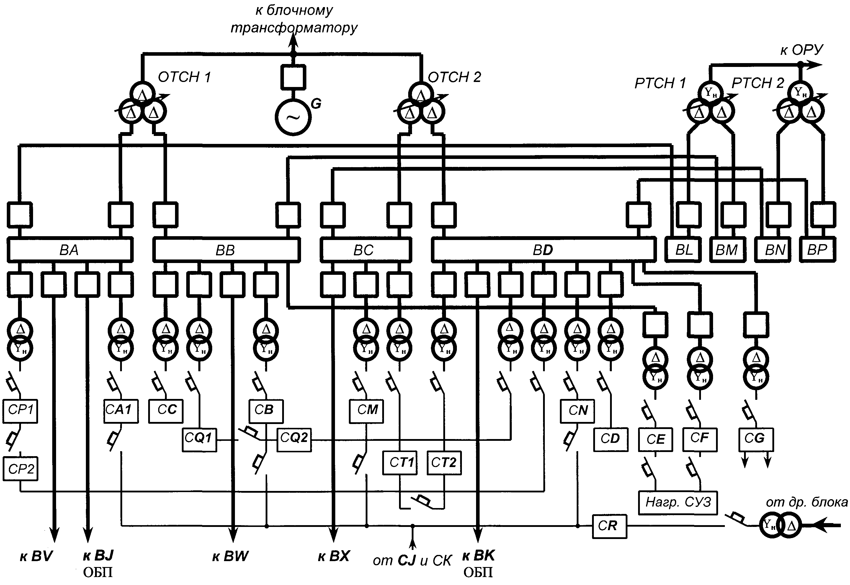 На рис. 9-9, г дана схема при условии трансформации на два напряжения, что характерно для мощных предприятий, находящихся на значительном расстоянии друг от друга.