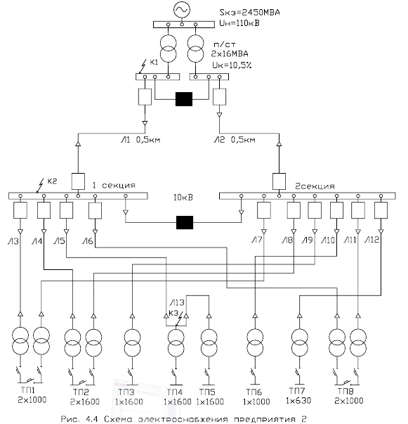 Напряжение 110 кВ наиболее широко применяют для электроснабжения предприятий от энергосистемы. Рост мощностей промышленных предприятий, снижение минимальной мощности трансформаторов на 110/6… 10 кВ до 2500 кВ А способствуют использованию напряжения 110 кВ для питания предприятий не только средней, но и небольшой мощности.