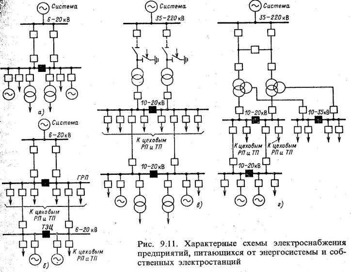 На рис. 9-9 приведены основные характерные схемы электроснабжения промышленных предприятий, питание которых производится только от энергосистем.