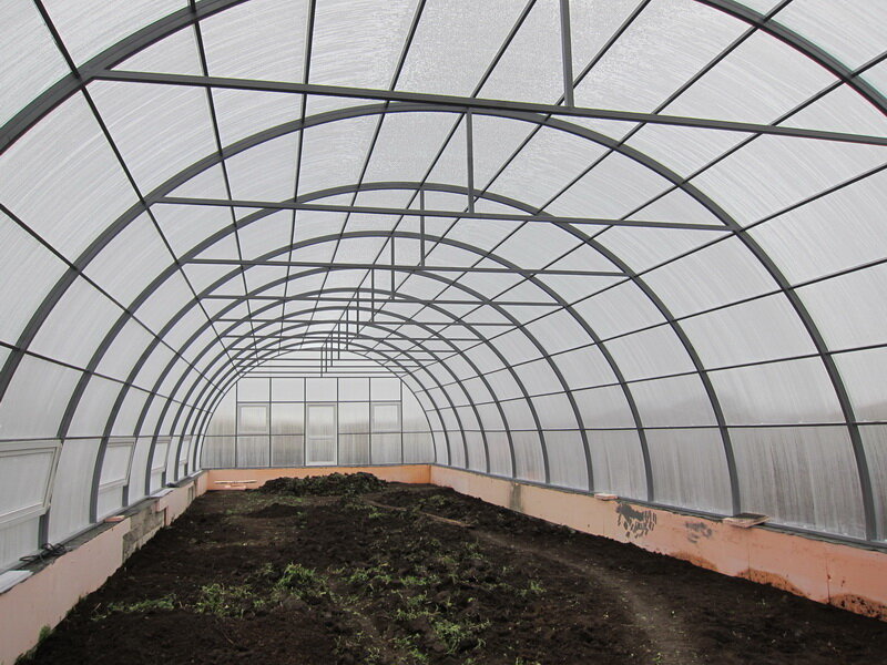 Положительным моментом этого типа теплицы является экономия на дорогой профильной трубе, а отрицательным — конструкция с отсутствием уклона конька подвержена большим временным нагрузкам и прочим. негативные последствия от естественных осадков. Например, на горизонтальной поверхности может скапливаться снег, в результате его таяния лед создает нагрузку, способную разрушить поликарбонат.