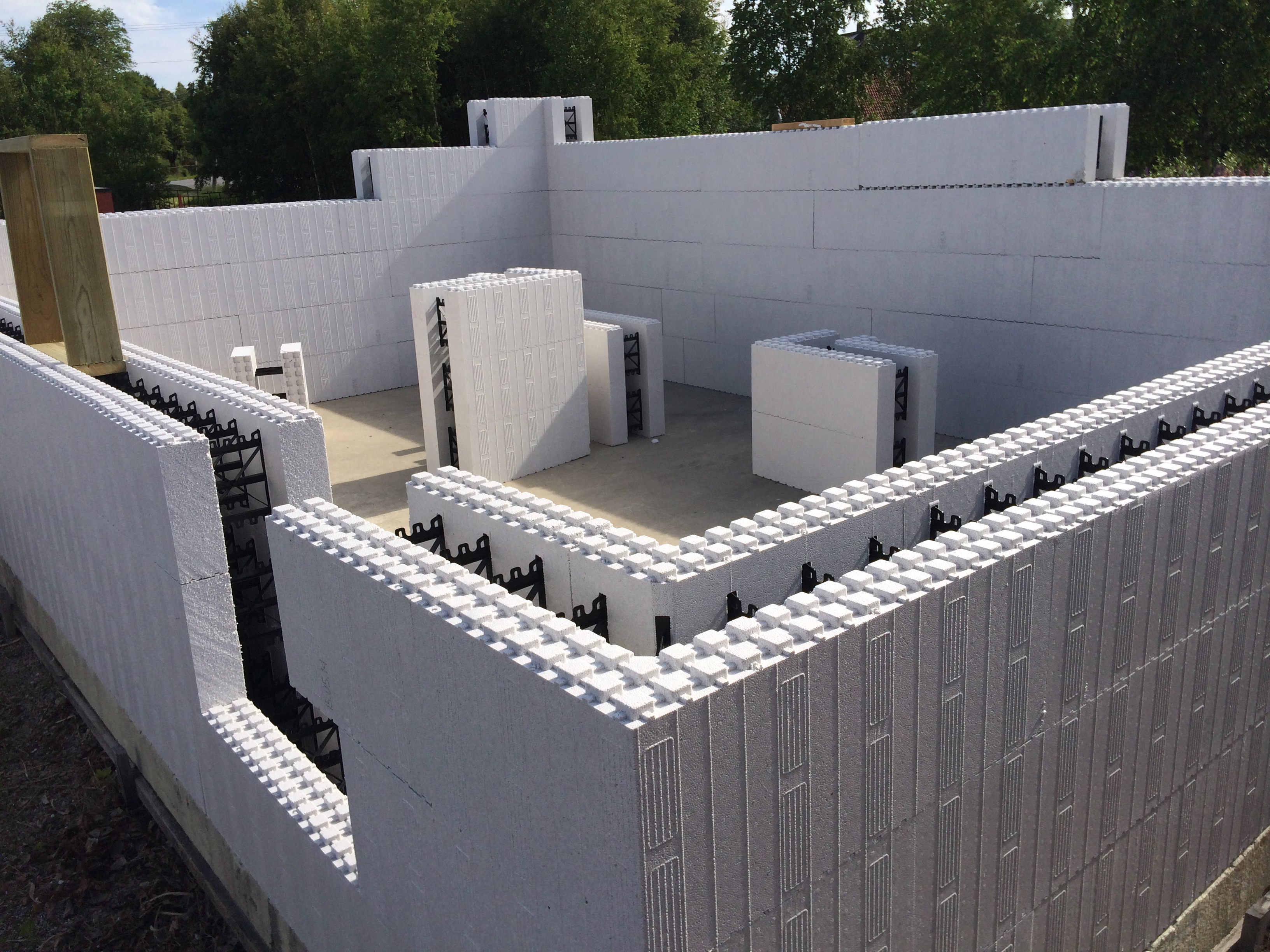 Чтобы продолжить возведение стен, необходимо первым делом выставить термоблоки по периметру в два ряда, состыковав их между собой. Стыковка блоков выполняется по принципу построения игрушечных домиков из конструктора лего. Каждый блок имеет в нижней части пазы, чтобы крепиться к предыдущему ряду, а в верхней части аналогичные выступы, чтобы служить основой для следующего ряда блоков. С боковых сторон блоки крепятся также, как и шпунтованные доски — один продольный паз и один продольный выступ, благодаря этому обеспечивается общая жёсткость и неподвижность пенополистирольной опалубки.