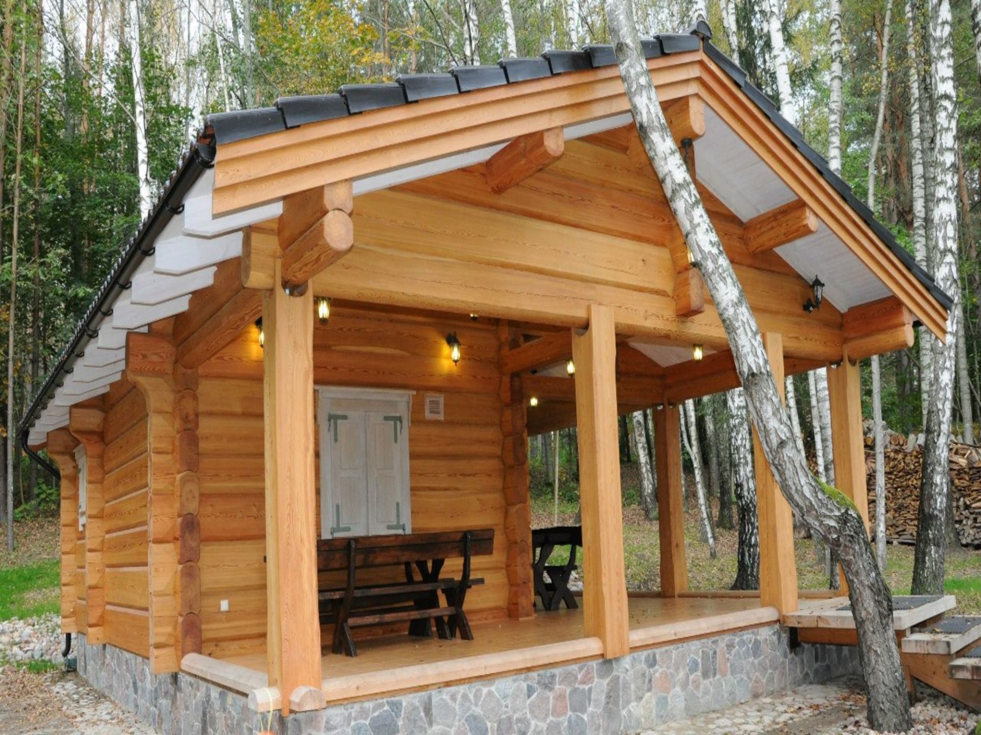 Веранда, пристроенная к бане, предусматривает два варианта входа: внутренний, из бани, и наружный, с улицы. Зачастую она возводится вдоль длинной стены, бывает квадратной, прямоугольной и полукруглой конструкции.