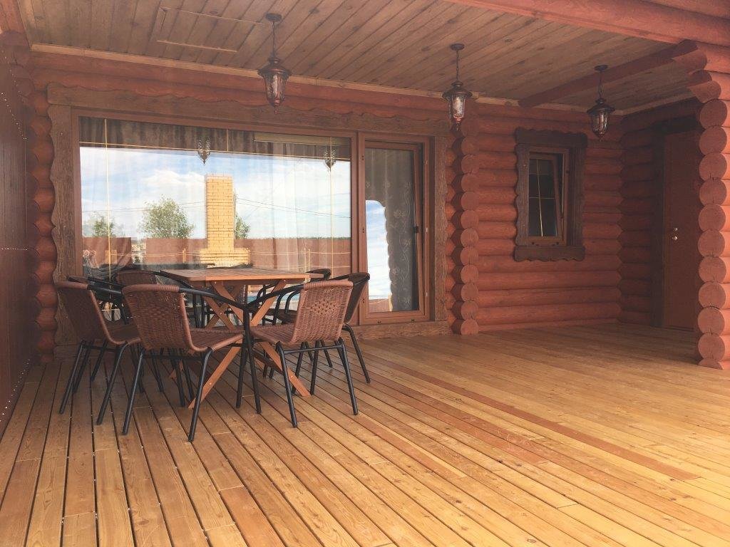 Для обычной бани размером шесть на шесть метров можно возвести террасу или веранду из бревна или бруса профилированного. Если строительство веранды будет вестись из бревна, то его диаметр должен составлять примерно миллиметров двести. Обязательно решите вопрос с расположением дверей, так вы сможете задействовать внутреннюю площадь значительно эффективней – барбекю, шезлонги, столы и стулья без особого труда смогут занять на площадке свои места.