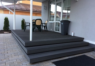 Для террас из ДПК характерна простота монтажа. По завершению установка, конструкция не требует дополнительной обработки. Материал износостойкий, не стирается в процессе эксплуатации. Мыть ДПК можно любыми моющими средствами.