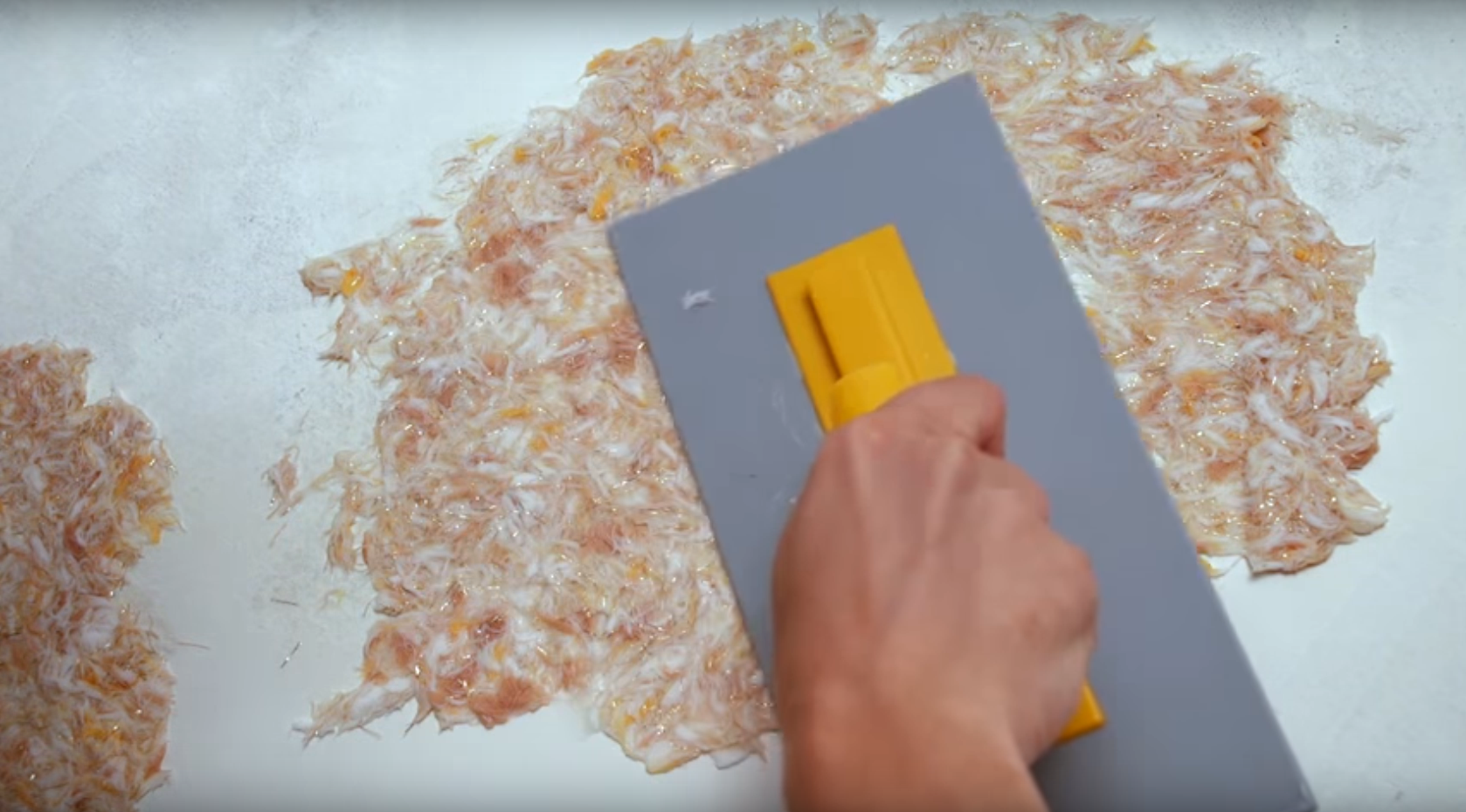 Наносить жидкие обои нужно равномерным слоем 2-3 мм в толщину.- После каждого нанесения разглаживать поверхность теркой.
