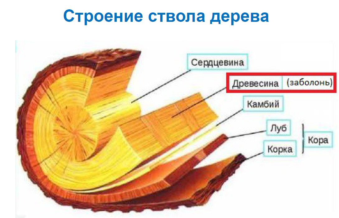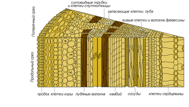 Кора 1 предохраняет дерево от внешних климатических воздействий. Внутренняя часть коры 2 называется лубом, проводящим питательные вещества. Между корой 1 и древесиной 4 находится камбий 3 — тонкий слой ткани, он служит для питания древесины и образования (отложения) годичного слоя ее.