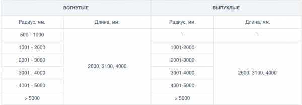 Специально для арочных и сложных конструкций выпускаются профили с положительной или отрицательной вогнутостью. Цена таких профилей несколько выше, чем стандартных, поэтому многие экономят и переделывают под арочные вертикальные элементы. Таблица размеров арочных профилей приведена ниже.