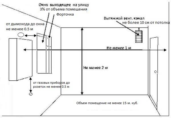 В кухонном пространстве разрешена установка оборудования с предельной мощностью 60 кВт. Для вентилирования обычно приспосабливают окно, имеющее форточку. Приток кислорода к установке обеспечивает обустройство внизу паза, решетки либо двери, размеры которых не менее 0,025 м2.