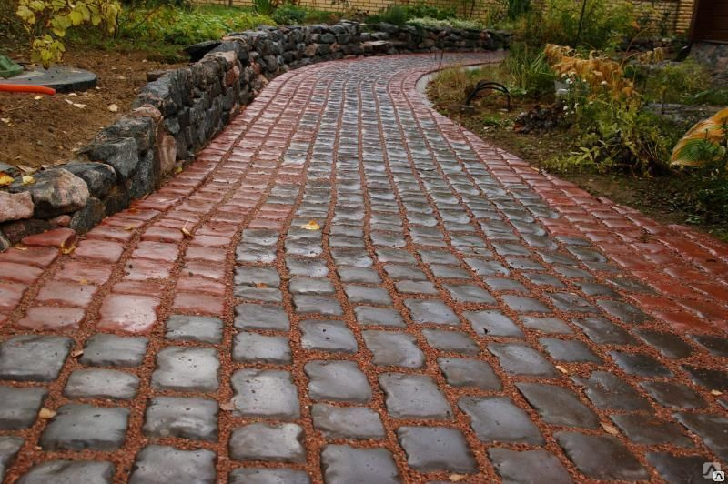 Это популярный вариант с разнообразием фактуры, цветов и формы, позволяющий проявить фантазию. Его можно укладывать, как мозаику, получая на дорожке узоры и даже рисунки