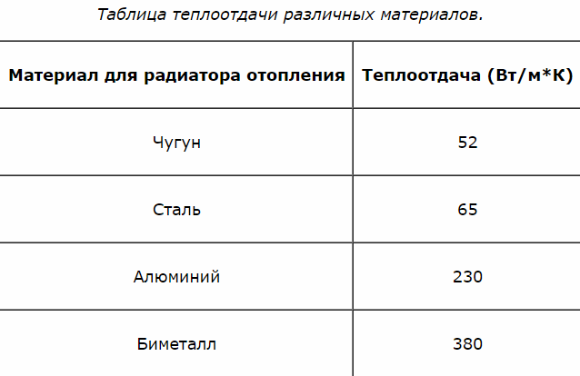 Нередко для подтверждения высокой теплоотдачи биметаллических радиаторов приводят табличные сведения, приведенные ниже.