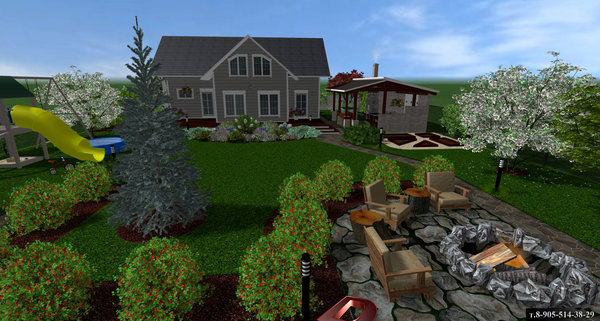 Необходимо составить дизайн территории. Для этого создают схему посадки деревьев и кустарников. Но нужно будет подбирать растения и знакомиться с их свойствами. В качестве фона для цветов и насаждений может быть газон и площадь мелких камней. Трава может быть искусственная – тогда стелют пластиковый ковер с ворсом. Красиво выглядят бруски из дерева, бревна, камни-валуны.