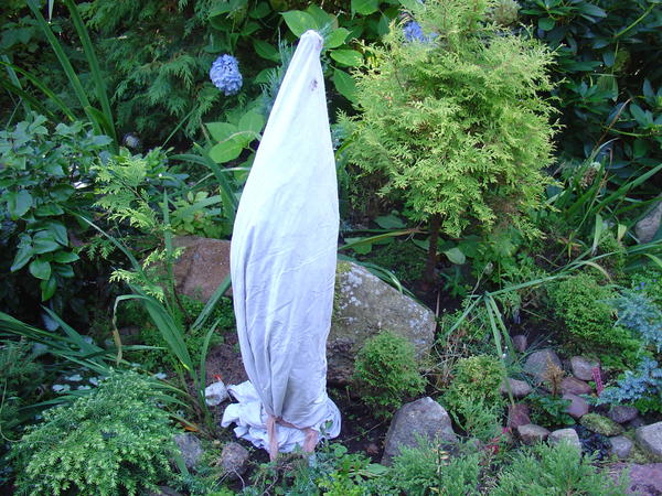 Так же очень сильно могут пострадать в зимний период крупномерные экземпляры (до 4 м) пересаженные осенью, надо постараться укрыть не только корни, но и крону. Можно аккуратно обернуть материалом все крупные ветки и слегка притянуть их к стволу.