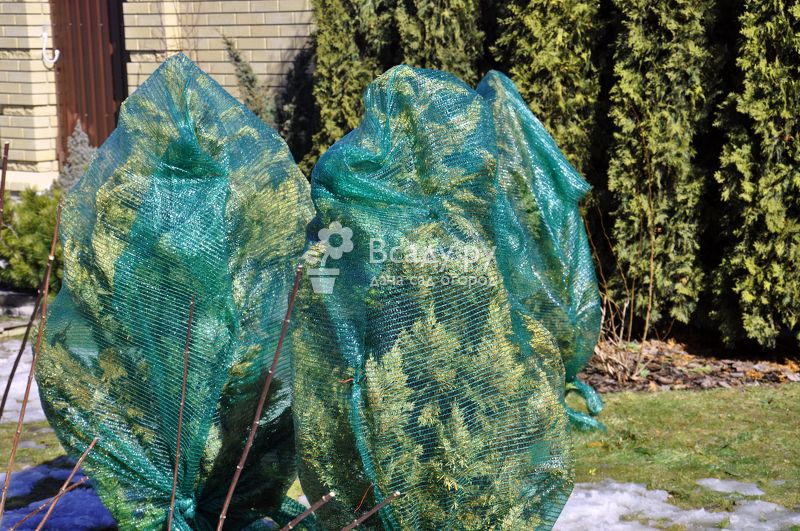 - Можно укрыть тую нетканым материалом, например, спанбондом. В зависимости от плотности, его можно сложить в три или четыре слоя. Нужно следить, чтобы тую не завалило снегом, иначе это грозит подпреванием хвои.
