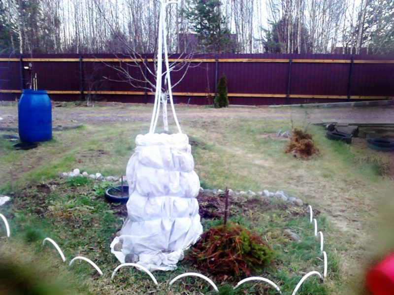 Что касается спанбонда, лутрасила и геотекстиля, то этот материал после укрывания кустов плотно закрепляется по всему периметру, отверстия не нужны.