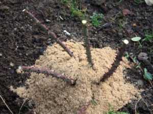 Перекопку делают осторожно, чаще всего с помощью вил. Самое главное – не повредить корневую систему растений. После этого розы окучиваются сухой почвой, торфом или песком. Вокруг каждого куста делается холм высотой 25-30 см.