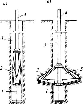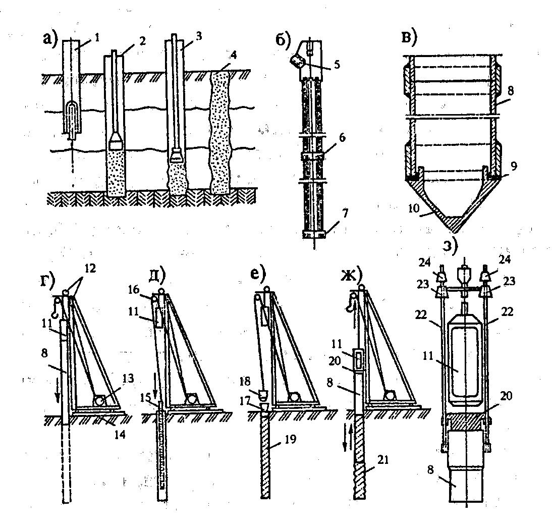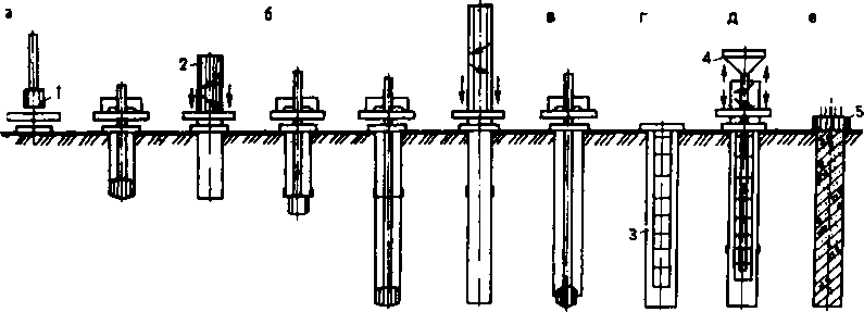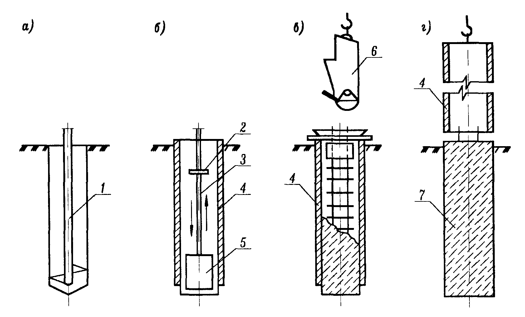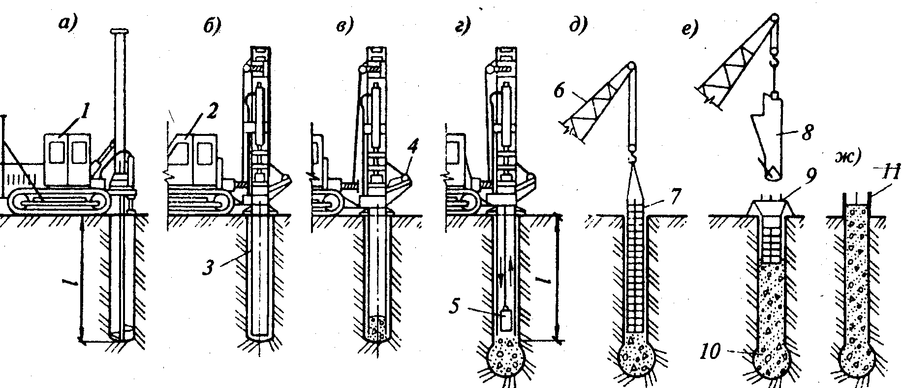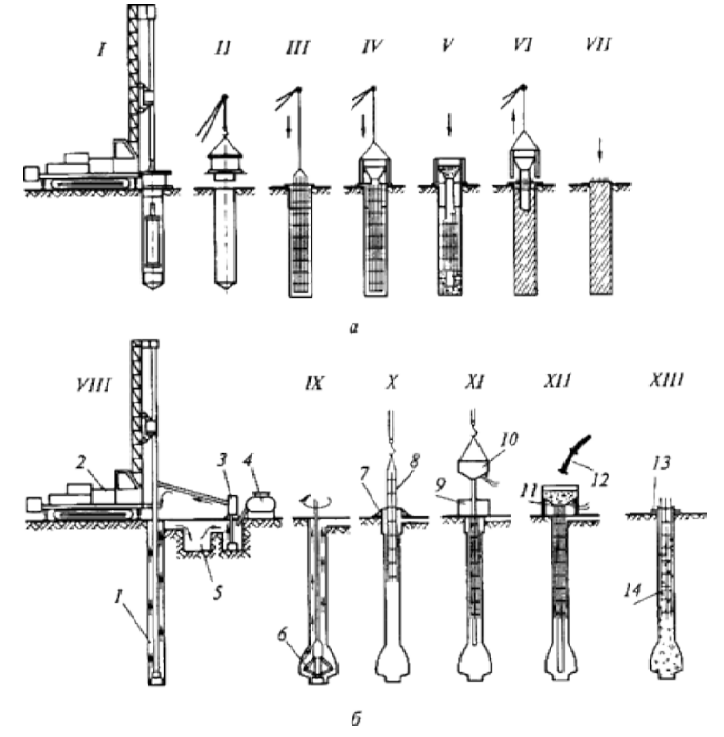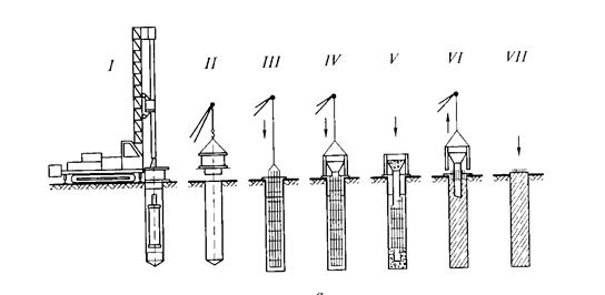 - бурение скважины (в несвязных грунтах — разработка грейфером, в плотных грунтах — разработка с помощью долота с удалением разрыхленного грунта — грейфером) с опережающим погружением обсадной трубы и наращиванием ее секциями;