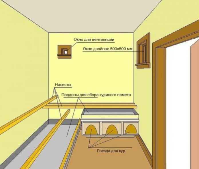 Устройство курятника внутри на 10 кур производят по предварительному чертежу.