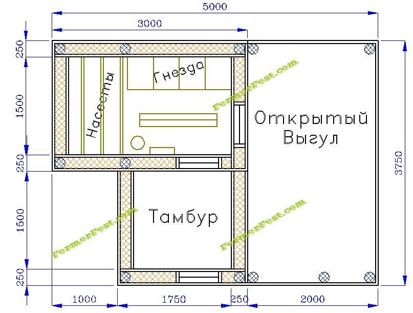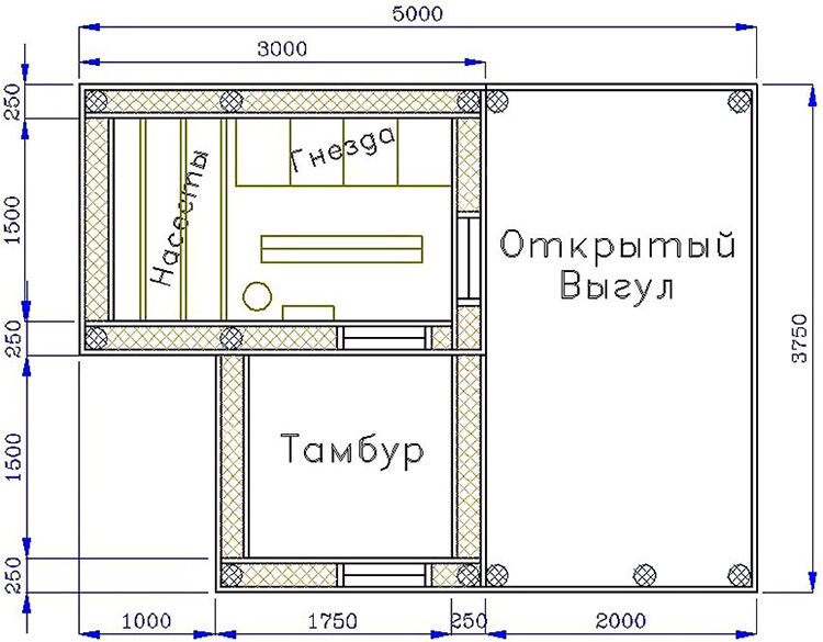 Чертеж зимнего курятника на 10 кур с тамбуром общим размером 5*3,75 м. Проект предусматривает обустройство 4 гнезд и насеста на 3 жерди.