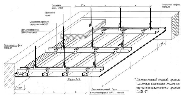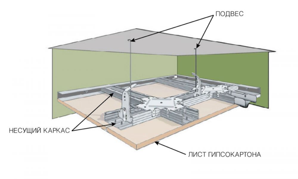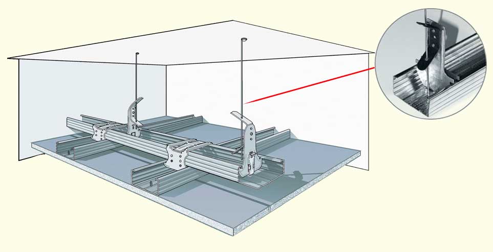 В конструкцию подвесного потолка входит прочный каркас из металла, состоящий из особых профилей, предназначенных для гипсокартона.