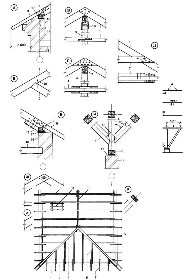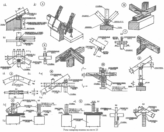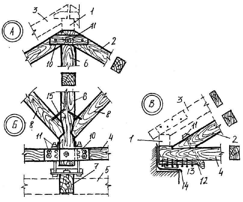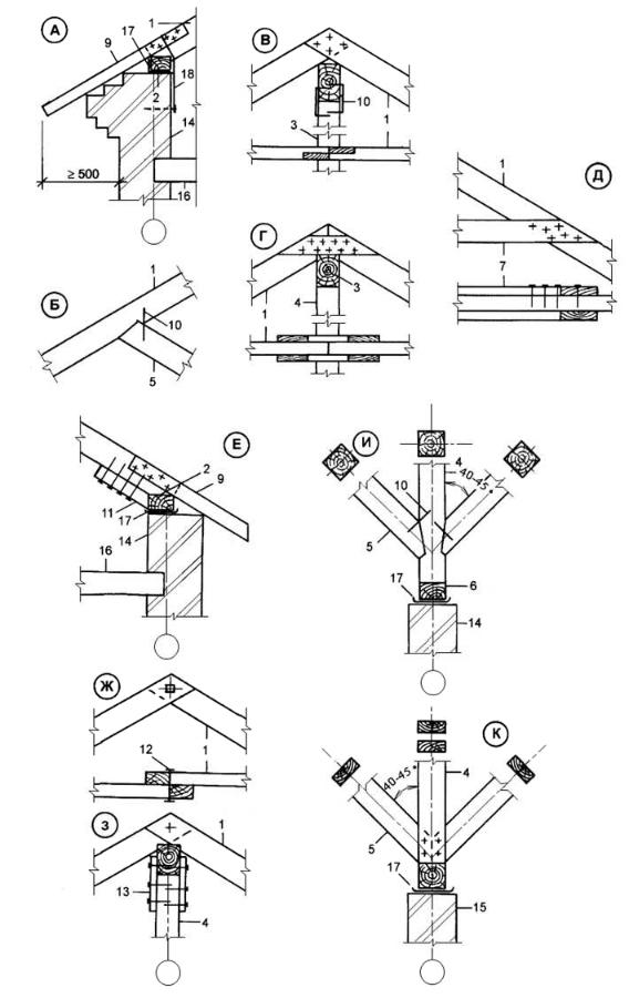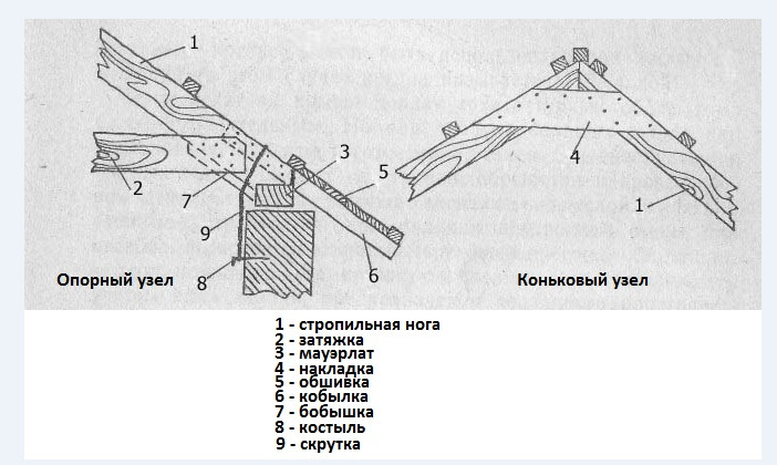 Основными узлами крепления стропильной систему кровли являются это балочный, коньковый и мауэрлатный.