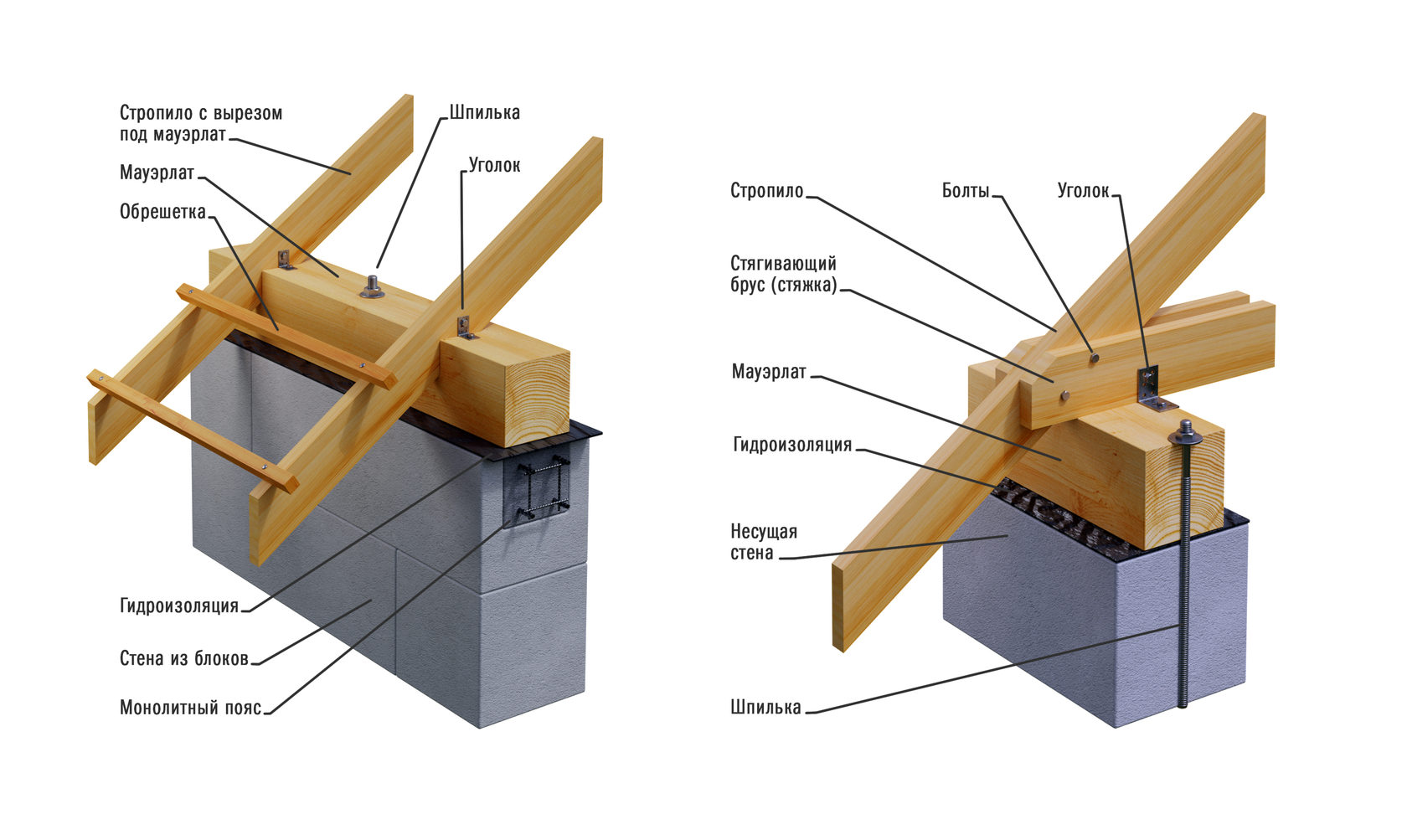 Опирание деревянных стропил на мауэрлат может выполняться по двум технологиям: