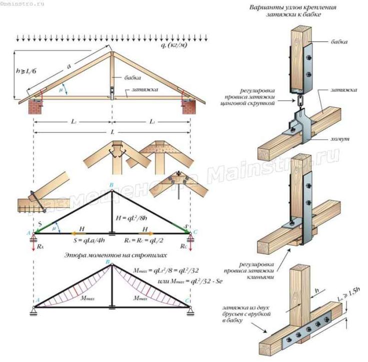 Висячие опираются на стены и создают распор. Чтобы уменьшить его, в основании стропил делают затяжки, которые соединяют стропила и образуют с ними треугольники. Висячие системы различных типов используются для домов шириной не более 17 м. В зависимости от ширины строения, устраивают их по-разному.