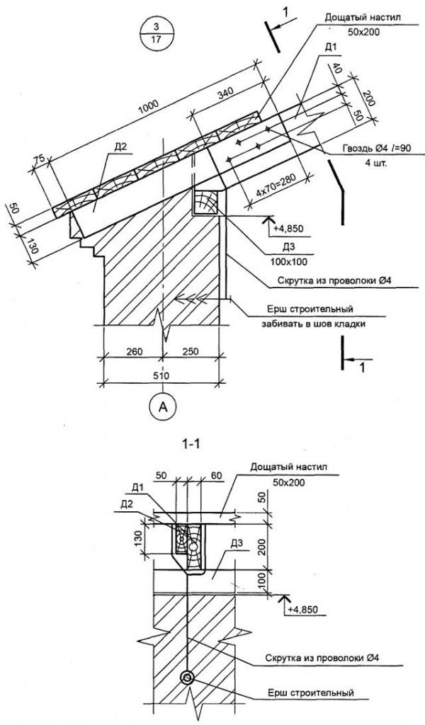 - с помощью забитых с двух сторон гвоздей, скрещивающихся в мауэрлате;