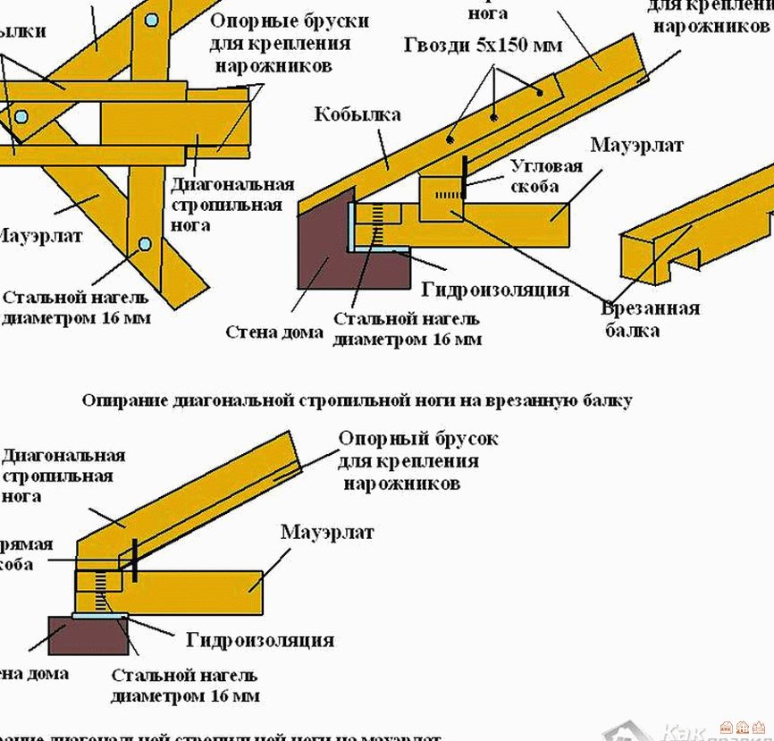 К балкам стропила прикрепляются следующим образом. Главная задача крепления — не допустить скольжения стропила по балке, поэтому используются различные приемы.