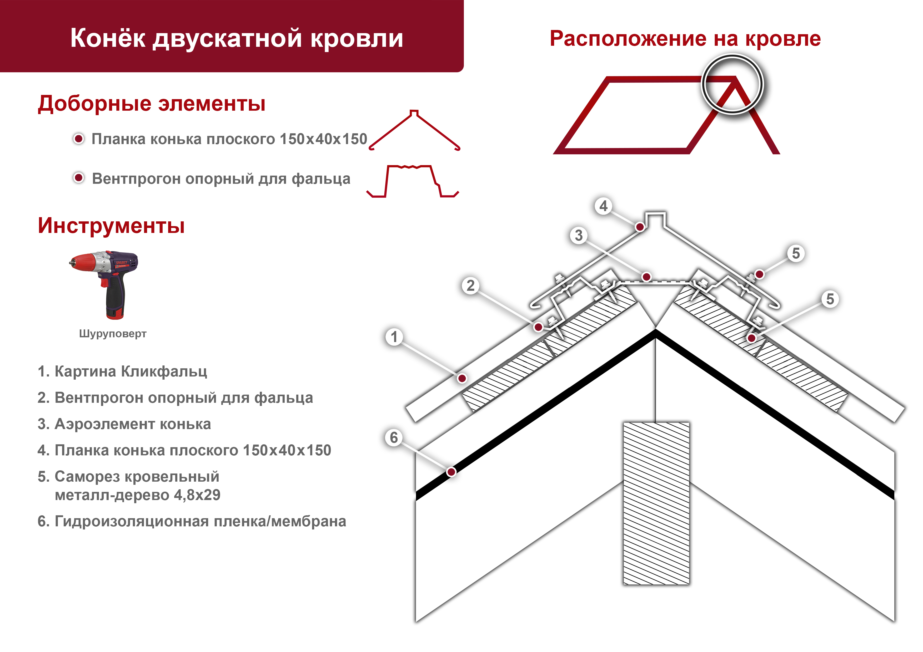 При креплении к коньковому прогону между стропилами дополнительно укладывается коньковая балка (прогон), этот способ более трудоемкий.