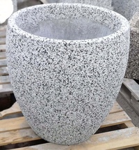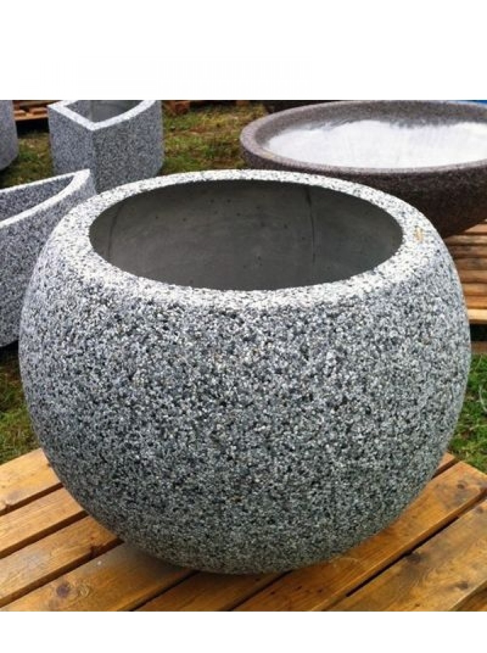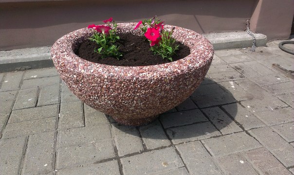 Для изготовления уличных вазонов можно использовать обычный бетон, состоящий из цемента и песка в соотношении 1:3/4 (портландцемент марки не ниже М 400 и речной чистый просеянный песок). Поверхность такого вазона будет однотонной, серой. В некоторых случаях это смотрится стильно, а серый цвет не отвлекает внимание от основного — от цветов. Но но далеко не всегда.