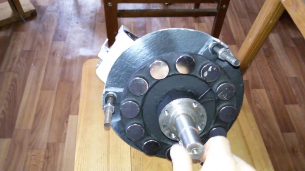 Если вы хотите узнать о создании, нужно сделать основой ступицу автомобиля с дисками тормоза, такой выбор вполне оправдан, ведь она мощная, надёжная и хорошо сбалансированная. После того как вы отчистите ступицу от краски и грязи, переходите к расстановке неодимовых магнитов. Их потребуется по 20 штук на диске, размер должен составлять 25х8 миллиметров.