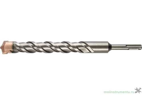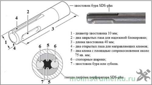 - бур sds plus – наиболее распространенный тип хвостовика диаметром 10 мм, длина вставляемой в патрон перфоратора части – 40 мм. Для установки имеет четыре открытых паза, воспринимающие крутящий момент. Такие буры, имеющие диаметр 4 — 26 мм, применяются на легких строительных профессиональных и бытовых перфораторах.