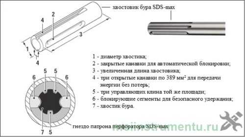 Хвостовик – износостойкая часть бура, выполненная из высокопрочной закаленной стали, вставляемая в патрон перфоратора. Именно форма хвостовика, в первую очередь, отличает бур от аналогичного спирального сверла. Профессиональный глаз мастера без ошибки определит, подойдет ли бур к тому или иному типу перфоратора, а новичкам строительного дела поможет в этом разобраться принятая маркировка хвостовиков SDS (Special Direct System – «особая управляющая система», разработанная фирмой Bosch):
