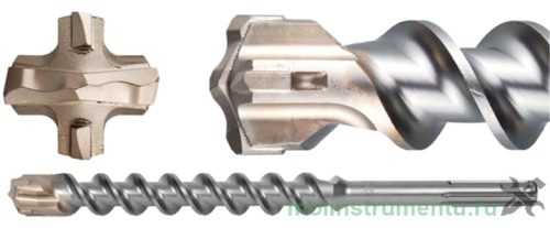 - бур sds max – второй по распространенности тип хвостовика, применяемый для буров большого диаметра (более 26 мм), используемых в тяжелых и мощных перфораторах, например, в электрических отбойных молотках. Диаметр такого хвостовика – 18 мм, длина вставляемой в патрон части – 90 мм.