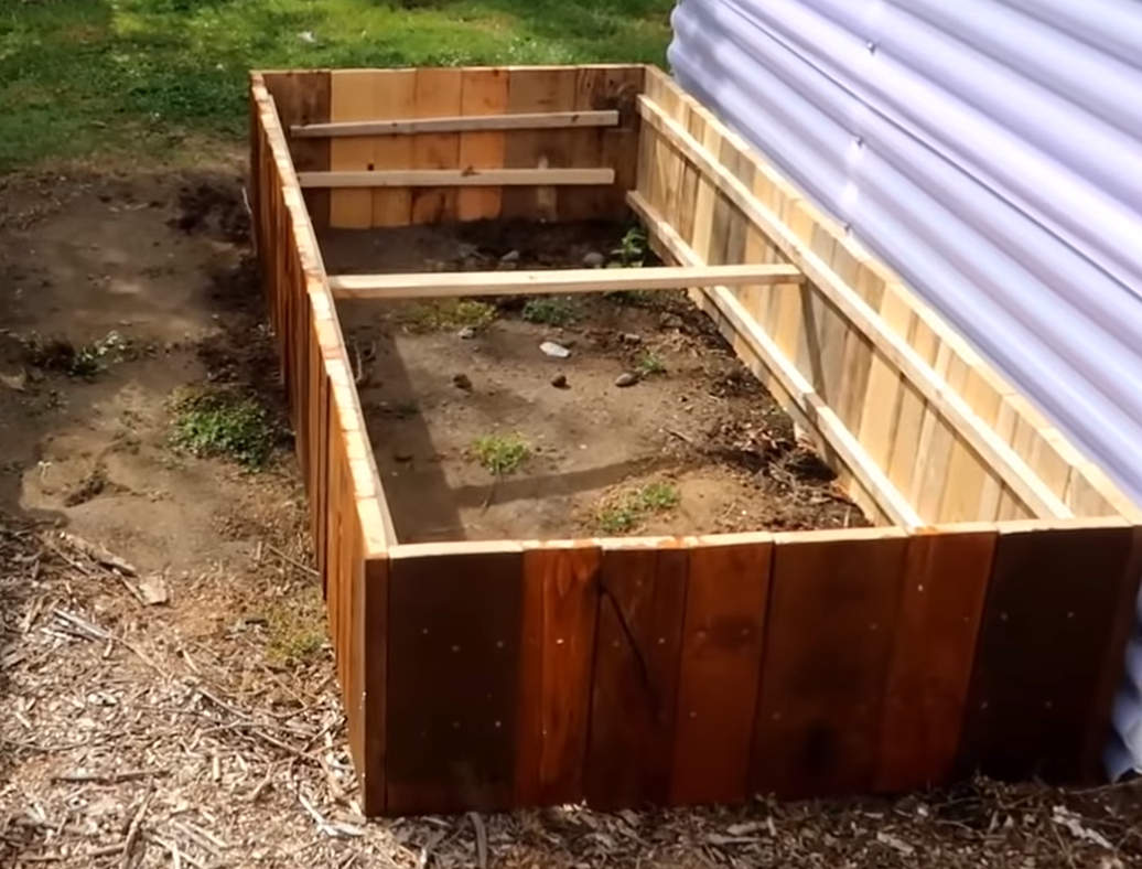 - Посередине длинной стороны грядки прибивается дополнительный брус, для большей прочности конструкции.