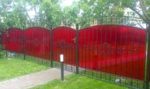Оригинальный забор из цветного поликарбоната на металлическом каркасе – это достаточно прочное, надежное ограждение. Выполнить ограду из одних только полимерных листов не получится – они не обладают достаточной жесткостью, чтобы уверенно «стоять» на ребре без дополнительной опоры. Весьма популярны карбонатные ограды, оформленные кирпичными, каменными столбами и металлическим штакетником. Кованый забор с пиками по верху, также допустимо декорировать золотистым, зеленым, фиолетовым, коричневым, розовым поликарбонатом.